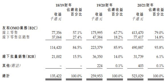 招股書顯示,友和集團截至 2021 年 3 月 31 日止三個財政年度的整體收益及淨利一直快速增長。於 18/19 財年、19/20 財年及 20/21 財年,公司的總收益分別約為 1.35 億港元、2.60 億港元及 5.23 億港元。B2C 模式下的友和 OMO 業務構成主要銷售渠道,佔整個往績記錄期間的總收益逾 80.0%。尤其是,來自線上零售的收益分別佔總收益約 57.1%、67.7% 及 79.0%。
