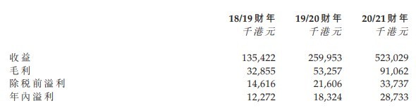 於 18/19 財年、19/20 財年及 20/21 財年,毛利分別約為 3285.5 萬港元、5325.7 萬港元及 9106.2 萬港元,毛利率分別約為 24.3%、20.5% 及 17.4%。毛利率下降的主要原因為公司為應付對產品 (尤其是利潤較低的若干主要品牌的電子產品及家庭電器) 的需求增加而拓展產品組合,以及提供具有競爭力定價的不同產品的多項全年推廣活動。年內溢利分別為 1227.2 萬港元、1832.4 萬港元及 2873.3 萬港元,淨利率分別約為 9.1%、7.0% 及 5.5%。