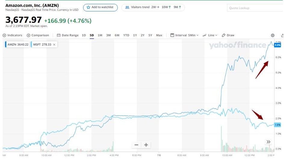 國防部的決定公佈後,亞馬遜股價進一步走高,午盤漲幅擴大到 4% 以上,股價史上首次漲破 3660 美元。微軟早盤尾聲時轉跌,午盤跌幅一度超過 1%。