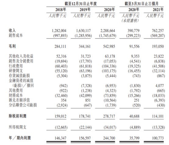 招股書顯示,金力永磁的幾乎全部收入來自銷售高性能釹鐵硼永磁材料。2018-2020 財年及 2021 年一季度,公司產生的總收入分別為 12.82 億元 (人民幣,單位下同)、16.3 億元、22.89 億元及 7.62 億元。相應期間,公司的淨利潤分別為 1.46 億元、1.57 億元、2.45 億元及 1.01 億元。其中,公司今年一季度淨利潤同比增加約 181.5%。