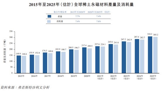 從市場空間來看,隨着世界對全球氣候變化的共識導致碳減排成為環境保護的關鍵方面,中國也計劃分別於 2030 年及 2060 年前實現碳達峯及碳中和。而稀土永磁材料在減少碳排放方面突顯出固有優勢,因此,稀土永磁材料 (主要包括釹鐵硼永磁材料) 的全球消耗量由 2015 年的約 14.66 萬噸增至 2020 年的 20.95 萬噸並預期將於 2025 年進一步增至 30.52 萬噸。