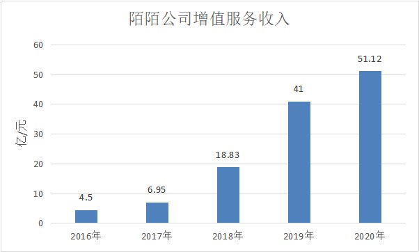 陌陌去年在會員費上的營收為 51.12 億元,2016 年—2020 年陌陌會員費分別為 4.5 億,6.95 億,18.83 億,41 億,51.12 億,5 年的時間陌陌增值服務收入逐漸放緩。