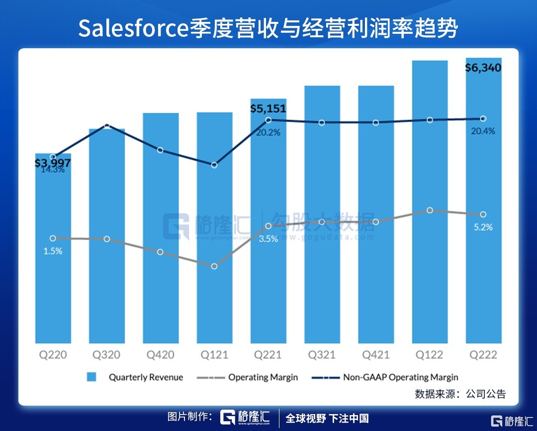 季度營收持續增長,且連續五季度保持 20% 以上的同比增速,訂閲和支持收入穩定在 94% 左右。二季度公認會計原則營業利潤率為 5.2%。剔除收購 Slack 的影響,非公認會計原則營業利潤率高達 20.4%。