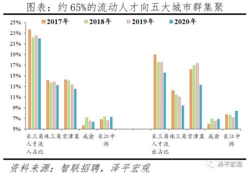 3)分城市群看,超 6 成人才流向五大城市群,2020 年长三角、珠三角、京津冀、成渝、长江中游城市群人才净流入占比分别为 6.4%、3.8%、-0.7%、0.1%、-1.2%,长三角、珠三角人才集聚,京津冀整体人才净流出,疫情期间流出趋势放缓,成渝基本平衡,长江中游人才持续净流出。从人才流入流出占比看,长三角人才流入占比和人才流出占比均呈下降趋势,2020 年分别为 22.00%、15.57%;珠三角人才流入占比较为稳定,人才流出占比分别逐年微降;京津冀 2017-2020 年人才流出占比分别为 16.2%、17.0%、17.3%、13.3%,逐年上升后有所放缓;成渝和长江中下游人才流入占比和人才流出占比均较为稳定。2017-2020 年分别有 64.7%、64.5%、63.1%、61.4% 的人才流入五大城市群,均超 6 成。从人才净流入占比看,2017-2020 年长三角分别为 4.6%、4.6%、5.0%、6.4%,人才净流入且占比高于其他城市群,人才大量向长三角集聚;珠三角分别为 2.0%、2.2%、2.8%、3.8%,人才净流入且逐年上升;京津冀分别为-1.9%、-2.9%、-4.0%、-0.7%,人才保持净流出但规模有所缩小,主要受河北地区人才净流入持续为负影响;成渝分别为-0.2%、0.3%、0.0%、0.1%,流入流出基本平衡;长江中游分别为-1.0%、-0.3%、-0.5%、-1.2%,2020 年受疫情因素影响呈人才净流出。