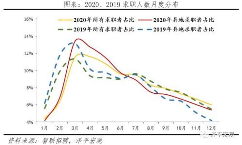 数据说明及特征:智联招聘拥有约 2.3 亿个人注册用户,日均活跃用户数(含登录、有求职行为的用户)约 630 万,其中,求职人才即当年有简历投递行为的用户中约 90% 为专科及以上学历,远超全国就业人口总体的 14.6%(2015 年小普查数据);在求职人才中,约四成为跨城求职者,即现居住城市和简历投向城市不同的流动人才,2020 年由于疫情,跨城求职者比 2019 年减少 2.3%。人才求职和跨城求职具有明显的月度波动性,求职高峰一般在春节后的 3 月,2020 年由于疫情,求职高峰稍微后移,2020 年 3 月求职人数和流动人数占比分别为 11.6%、13.4%,2019 年分别为 11.3%、13.1%。