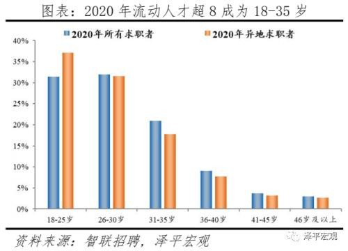 2)从年龄看,流动人才中超 8 成为 18-35 岁。2020 年求职人才中 18-25 岁、26-30 岁、31-35 岁、36-40 岁、41-45 岁、46 岁及以上分别占比 31.4%、32.0%、20.9%、9.1%、3.7%、2.9%;异地求职人才中各年龄段人才分别占比 37.1%、31.5%、17.8%、7.7%、3.2%、2.7%,求职人才和流动人才的年龄结构较为吻合,18-35 岁分别占比 84.3%、86.4%,而在 2019 年上述比例分别为 85.1%、84.4%,2020 年异地求职人才更加集中于 18-35 岁。