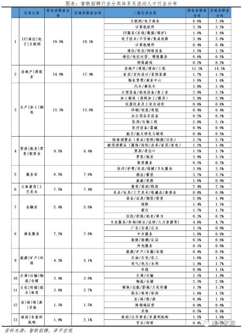 6)从行业看,流动人才中 50.3% 分布在 IT、房地产、制造业,高于求职人才总体的 48.0%。2020 年求职人才最多的前三行业是 IT| 通信 | 电子 | 互联网、房地产 | 建筑业、生产 | 加工 | 制造,分别占比 19.8%、14.9%、13.3%,合计占比 48.0%;流动人才最多的前三行业也是上述三个行业,分别占比 19.1%、17.4%、13.8%,合计占比 50.3%,说明流动人才分布更加集中,且流动人才在房地产 | 建筑业的分布远高于所有求职人才。从二级行业分布来看,2020 年求职人才最多的前五行业分别是房地产/建筑/建材/工程、互联网/电子商务、教育/培训/院校、专业服务/咨询(财会/法律/人力资源等)、零售/批发,合计占比 35.9%;流动人才最多的前五行业则略有不同,第五名为电子技术/半导体/集成电路,合计占比 37.8%。