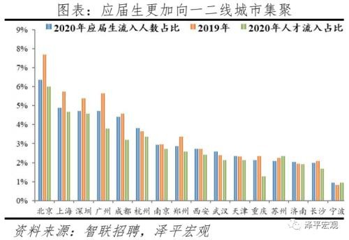 2020 年应届生、硕士及以上人才将简历投向北上深广的比重分别占比 20.7%、30.9%,均高于流动人才流向北上广深的整体比重 19.07%,应届生和硕士及以上人才更倾向往一二线城市集聚。从应届生看,应届生人才流入占比前四名分别是北上深广,合计占比 20.7%,高于北上深广的人才流入占比 19.1%;应届生人才流入前十城市还有成都、杭州、南京、郑州、西安、武汉,前十合计占比 40.0%,高于前十城市的人才流入占比 35.5%,意味着和流动人才相比,应届生人才更加向一二线城市集聚。和 2019 年相比,2020 年流入北京、广州、上海的应届生占比分别下降 1.3%、0.9%、0.9%,流入武汉、杭州的应届生占比分别上升 0.2%、0.2%。从硕士及以上人才看,硕士及以上人才流入占比前四名分别是北上深和成都,合计占比 31.3%,高于北上深成人才流入占比的 18.5%;硕士及以上人才流入前十城市还有杭州、广州、南京、天津、西安、武汉,前十合计占比 51.4%,高于前十城市的人才流入占比 35.1%,意味着和流动人才相比,硕士及以上人才也更倾向往一二线城市集聚,尤其是向一线城市集聚。和 2019 年相比,流入北京、深圳的硕士及以上人才占比分别下降 1.5%、0.8%,流入成都、西安、苏州、南京的人才分别上升 0.4%、0.3%、0.2%、0.2%。