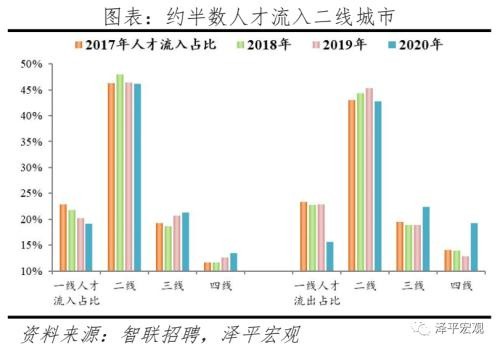 2)分线城市看,2020 年一线城市人才跨区流动性下降,三四线城市人才流动性增强,一线、二线、三线、四线人才净流入占比分别为 3.5%、3.4%、-1.0%、-5.8%,2019 年分别为-2.7%、1.1%、1.8%、-0.3%,结合近 4 年数据观察,二线人才持续集聚,一线人才受政策放宽影响转为净流入,三线较为平衡,四线持续流出。我们把全国 296 个地级及以上建制市划分为一二三四线城市 [ 详见泽平宏观 2019 年 4 月报告《中国城市发展潜力排名:2019》],其中,一线城市为北上广深 4 个,二线城市 35 个,三线城市 81 个,四线城市 176 个。从人才流入流出占比看,2017-2020 年一线城市人才流入占比及流出占比均呈下降趋势,2020 年降幅明显,说明疫情期间一线城市人才跨区流动倾向减弱;二线城市人才流入占比分别为 46.3%、47.9%、46.4%、46.2%,约半数人才流入二线城市,人才流出占比在 2020 年也有下降;三线城市人才流入占比分别为 19.3%、18.6%、20.8%、21.3%,近两年上升较为明显,2020 年人才流出占比上升;四线城市人才流入占比分别为 11.6%、11.6%、12.6%、13.4%,上升较为明显,但同时人才流出占比也大幅提升,三四线城市人才跨区流动行为相对更加活跃。从人才净流入占比看,2017-2020 年一线分别为、-0.5%、-0.9%、-2.7%、3.5%,一线人才净流入占比于 2020 年转为正值,主要受人才流出趋势放缓影响;二线分别为 3.2%、3.6%、1.1%、3.4%,二线人才持续集聚;三线分别为-0.3%、-0.3%、1.8%、-1.0%,较为平衡;四线分别为-2.5%、-2.3%、-0.3%、-5.8%,人才净流出趋势加剧。