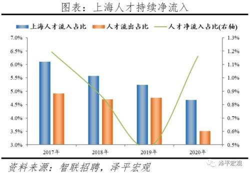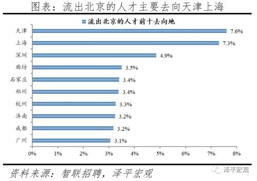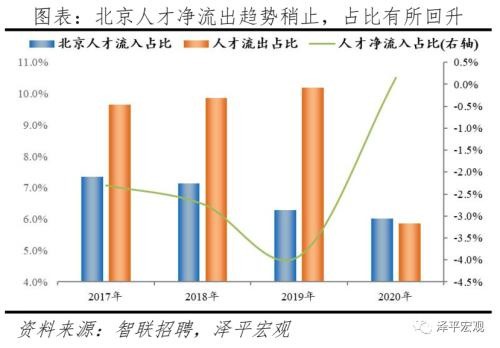 1)北京:2017-2020 年人才净流入占比分别为-2.3%、-2.7%、-3.9%、0.2%,持续为负值至 2020 年转为正值,主因北京过往严控人口、疏解产业,直至今年复产复工期间企事业单位招聘与留才力度加大;疫情期间,人口流动范围收窄,天津代替上海,成为北京人才流入流出第一目标城市,北京流向天津、天津流向北京的人才流出在全国流动人才总量中占比分别为 0.5%、0.6%,人才从天津净流向北京。北京常住人口增量逐年下滑,2011-2018 年从 57 万降至-17 万,2019 年缩窄至-1 万,2017-2019 年连续 3 年为负,2016-2019 年北京的常住人口增量始终在一线城市中最低。2017-2020 年北京人才流入占比分别为 7.3%、7.1%、6.3%、6.0%,持续下降,但人才流出占比持续攀升,到 20 年流出比例有所下降,分别达 9.6%、9.9%、10.2%、5.9%,北京的人才流入和人才流出均居全国城市首位,但过往流出逐年攀升、流出明显大于流入,使得人才净流入占比分别为-2.3%、-2.7%、-3.9%,直至 2020 年人才流出放缓,净流出转为正值。从来源看,2020 年人才向北京流入的前十大城市分别为天津、上海、廊坊、保定、郑州、石家庄、沈阳、成都、西安、深圳,合计占比达 39.7%。人才流入北京主要因为北京经济体量大、薪酬水平高,2020 年 GDP 规模达到 3.6 万亿,仅次于上海、排名第二,同时 13 个行业中北京有 8 个的薪酬位于所有城市之首,城镇人均可支配收入居全国榜首。从去向看,北京人才外流的前十大城市分别为天津、上海、深圳、廊坊、石家庄、郑州、杭州、济南、成都、广州,合计占比达 42.8%。其中,流出北京的人才中 7.6% 流向天津,流出天津的人才中 27.7% 流向北京,北京和天津互为人才外流目标城市的第 1 位,北京流向天津、天津流向北京的人才流出在全国流动人才总量中占比分别为 0.5%、0.6%,人才从天津净流向北京。人才流出北京主要因为北京控制人口、疏解产业。2015 年发布的《京津冀协同发展规划纲要》要求北京外迁非首都核心功能,2020 年及之后北京常住人口控制在 2300 万人以内。京津冀人才流动数据侧面反映京津冀协同发展已进入中期节点,北京持续疏解非首都核心功能,与津冀对接协同产业。根据北京市发改委数据,截至 2019 年底,北京市不予办理的工商登记业务累计达 2.28 万件;2014-2019 年北京市退出一般制造业企业 2759 家,疏解提升市场 631 个、物流中心 122 个,三地产业协同、交通一体、科创形成园区链。京津冀一体化进程促进人才向北京集聚,人才向北京流入的前十城市中津冀城市有 4 个,合计占比达 20.6%,高于 2019 年的 15.6%,;北京周边城市群人才承接能力则较弱,人才从北京流出的前十城市中津冀城市为 3 个,仅占 14.5%,占比较 2019 年的 13.6% 稍有上升。人才产业上,2020 年北京流入人才的 25.9% 来源于 IT| 通信 | 电子 | 互联网行业,高于除深圳、杭州外的其他 8 个重点城市,也高于北京流出人才流向该行业的比例 22.8%;2019 年北京流入人才中 IT| 通信 | 电子 | 互联网行业仅占比 23.4%,低于流出人才中的占比 29.7%。2020 年北京对 IT| 通信 | 电子 | 互联网行业人才吸引力有所加强。