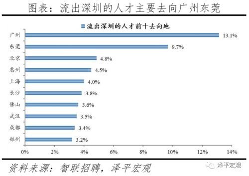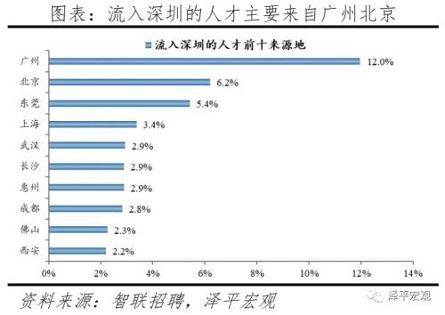 3)深圳:2017-2020 年人才净流入占比分别为 0.1%、0.4%、0.2%、1.3%,主因新兴产业发展速度快、宽松且不设指标上限的入户政策;深圳和广州互为人才外流第一目标城市,深圳流向广州和广州流向深圳的人才流出在全国流动人才总量中占比分别为 0.7%、0.6%,规模基本平衡。2015 年深圳常住人口增量从 2014 年的 15 万大幅上升至 60 万,2015-2019 年平均增量为 53 万。2017-2020 年深圳人才流入占比基本稳定在 4.8% 左右,分别为 5.1%、5.0%、4.7%、4.6%,但人才流出占比呈下降趋势,分别为 5.0%、4.9%、4.6%、4.6%、3.3%。从来源看,人才向深圳流入的前十大城市分别为广州、北京、东莞、上海、武汉、长沙、惠州、成都、佛山、西安,合计占比达 43.0%,低于 2019 年前十来源地的 52.8%,深圳的人才来源集中度有所下降。其中,珠三角城市有 4 个,占比 22.5%;流入深圳的人才中 12.0% 来自广州,流入广州的人才中 11.40% 来自深圳,深圳和广州互为人才来源城市的第 1 位。人才流入深圳主要因为经济发展速度相对较快和人才政策有吸引力。2020 年深圳 GDP 增速 3.1%,高于全国平均的 2.3%,也远高于广州、上海和北京的 2.7%、1.7%、1.2%;2016-2020 年深圳平均 GDP 增速为 7.0%,高于广州、上海、北京的 6.2%、5.6%、5.5%。深圳还拥有华为、腾讯、平安等众多著名企业,尤其是互联网企业,吸引大量人才。深圳的落户政策逐渐放宽,且补贴幅度较大,根据深圳市人力资源和社会保障局数据,2016 年深圳将全日制本科生、硕士、博士的租房相关补贴从 6000、9000、12000 元分别提高至 15000、25000、30000 元,2017 年落户门槛放宽至 35 岁以下专科学历人才,对新引进的两院院士和杰出人才、地方级领军人才、后备级人才分别给予 300 万、200 万、160 万的奖励。从去向看,深圳人才外流的前十大城市分别为广州、东莞、北京、惠州、上海、长沙、佛山、武汉、成都、郑州,合计占比达 53.7%,与 2019 年前十去向地的 53.9% 接近持平,深圳人才流向的方向无明显变化。其中,广州占比达 13.1%,珠三角城市有 4 所,合计占比 31.0%,深圳和珠三角地区人才流动频繁;流出深圳的人才中 13.1% 流向广州,流出广州的人才中 18.7% 流向深圳,深圳和广州互为人才外流目标城市的第 1 位,深圳流向广州和广州流向深圳的人才流出在全国流动人才总量中占比分别为 0.4%、0.6%,规模基本平衡。2020 年流入、流出深圳的行业人才中 IT| 通信 | 电子 | 互联网占比达 30.7%、29.3%,均远高于其他 9 个城市,深圳 IT| 通信 | 电子 | 互联网行业人才流动频繁。