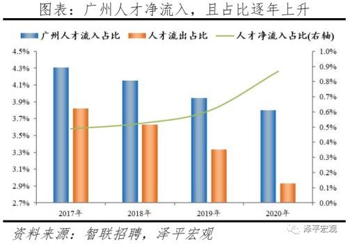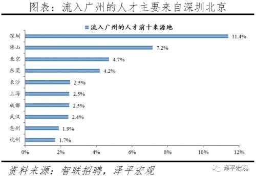 4)广州:2017-2020年人才净流入占比分别为 0.5%、0.5%、0.6%、0.9%,人才净流入且持续稳定增长,主因广州发展速度较快、生活成本在一线城市中最低。广州常住人口增量总体呈上升趋势,2011-2019 年从 4 万升至 40 万。2017-2020 年广州人才流入占比基本稳定在 4.1% 左右,分别为 4.3%、4.2%、3.9%、3.8%,略呈下降趋势,人才流出占比持续下降,分别为 3.8%、3.6%、3.3%、2.9%,流入大于流出,使得人才净流入占比分别为 0.5%、0.5%、0.6%、0.9%,逐年上升。从来源看,人才向广州流入的前十大城市分别为深圳、北京、佛山、东莞、上海、长沙、成都、武汉、惠州、杭州,人才流入占比合计达 41.0%。其中,深圳占比 11.4%,珠三角城市有 4 个,合计占比 24.6%。人才流入广州主要因为发展速度较快、生活成本较低。2019 年广州 GDP 增速为 6.8%,高于北京、上海、深圳的 6.1%、6.0%、6.7%;2020 年广州 GDP 为 2.7%。高于全国平均 2.3%。广州的生活成本在一线城市中最低,根据英国经济分析智囊机构经济学人智库(EIU)发布的《2019 年全球生活成本调查报告》,在全球 133 个城市样本中,上海与深圳排名并列第 25 位,北京、广州分别排名 49、68 位;2019 年北京、上海、深圳、广州的房价收入比分别为 26.5、22.0、21.4、13.2 年,广州的房价和生活成本在一线城市中最低。2020 年广州流入人才的 13.3%、4.1% 流入贸易、批发、零售、租赁业,以及服务业,明显高于其余 9 个重点城市。从去向看,广州人才外流的前十大城市分别为深圳、佛山、东莞、珠海、北京、上海、杭州、惠州、中山、长沙,人才流出占比合计达 58.2%。其中,深圳和佛山占比分别为 18.7%、12.2%,珠三角城市有 6 个,合计占比 46.2%,高于 2019 年的 44.9% 与北京 14.49% 的人才流向京津冀都市圈、上海 34.6% 的人才流向长三角都市圈和深圳 32.3% 的人才流向珠三角都市圈相比,广州人才流向珠三角都市圈城市的比重显著更高。一方面是因为珠三角多为粤语城市、文化相近,另一方面是广州高校数量较多,广东省人才为求学向广州集聚,毕业后从广州回流至省内其他城市。根据教育部数据,广州普通高校数、211 高校数分别为 37、6 所,分别排名第 5、6 名;根据国家统计局数据,2019 年广州普通本专科在校生人数为 114.1 万人、位列全国第一。