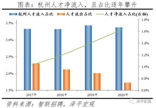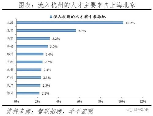 1)杭州:2017-2020 年人才净流入占比分别为 1.0%、1.2%、1.4%、1.6%,始终为正且逐年攀升,人才吸引力排名稳居前列,主因杭州以电商为代表的产业发展迅速、宜居的人文环境、薪酬超越广州在十大城市中位列第四。2013-2019 年杭州常住人口增量从 4 万逐渐增至 55 万,2019 年常住人口增量杭州排名全国第一。2017-2020 年杭州人才流入占比分别为 3.3%、3.3%、3.4%、3.4%,人才流出占比分别为 2.3%、2.1%、2.0%、1.7%,人才流入明显大于流出,使得人才净流入占比分别为 1.0%、1.2%、1.4%、1.6%,逐年攀升,连续三年居全国之首。从来源看,人才向杭州流入的前十大城市分别为上海、北京、南京、西安、郑州、宁波、成都、广州、武汉、绍兴,合计占比达 36.2%,明显低于 2019 年杭州人才前十来源地的 46.6%,杭州的人才来源更加多元。其中,来自上海和北京的人才合计占比 15.8%,杭州发展所需人才主要在一线城市中,杭州也具有从一线城市抢夺人才的能力。且杭州前十来源地有 4 个来自长三角地区,合计占比达 18.2%。人才流入杭州主要是因为产业发展迅速,尤其以阿里巴巴为代表的电商行业发展较快。根据杭州市统计局,2019 年杭州数字经济产业增加值增长 15.1%,其中,电子商务产业增加值 14.6%,均高于杭州 GDP 增速 6.8%。2020 年杭州流入人才 29.5% 流向 IT| 通信 | 电子 | 互联网行业,明显高于除深圳外的 8 个重点城市,其中,10.9% 流向互联网/电子商务二级行业,高于其余 9 个重点城市。同时杭州薪酬较有吸引力,在十个重点城市中位列第四,高于广州,其中 13 个行业中杭州薪酬 1 个位列第二,3 个位列第三,8 个位列第四。从去向看,杭州人才外流的前十大城市分别为上海、宁波、苏州、北京、南京、广州、西安、绍兴、深圳、嘉兴,合计占比达 44.9%。其中,有 5 个去向长三角地区,合计占比达 26.4%。