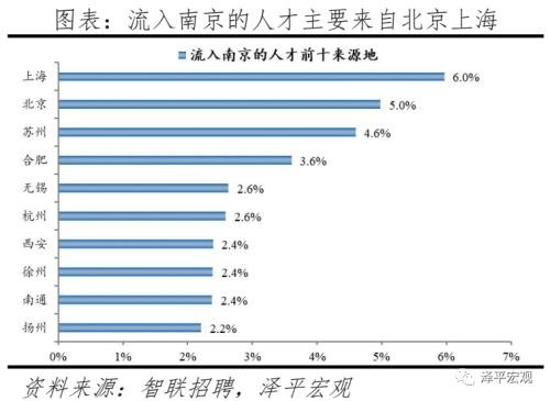 2)南京:2017-2020 年人才净流入占比分别为 0.9%、0.9%、0.9%、0.9%,始终为正且比较稳定,主因南京电子通信、制造业发展较快且 2018 年 “宁聚计划” 实施吸引人才。和上述其他城市相比,南京常住人口增量相对稳定,2011-2019 年始终在 2-10 万区间波动、2019 年为 6 万。2017-2020 年南京人才流入占比分别为 3.0%、2.9%、2.8%、2.7%,人才流出占比分别为 2.1%、1.9%、1.9%、1.8%,均逐年下降,但人才流入明显大于流出,使得南京人才净流入占比分别为 0.9%、0.9%、0.9%、0.9%,基本稳定。主要因为落户条件放宽且电子通信、制造业等行业增长速度较快。2018 年 “宁聚计划” 即《人才落户实施办法》实施,不再以就业为落户前提,年龄条件也从 35 岁放宽到 40 岁。根据各市统计局数据,2020 年南京 GDP 同比增长 4.6%,在十大重点城市中排名第一;2020 年南京规模以上工业增加值同比增长 6.5%,高于全国的 2.8%,其中以新能源汽车、工业机器人(行情300024,诊股)、集成电路产业增长最为亮眼。从来源看,人才向南京流入的前十大城市分别是上海、北京、苏州、合肥、无锡、杭州、西安、徐州、南通、扬州,合计占比达 33.8%。其中,有 8 个是长三角地区,合计占比达 26.37%。从去向看,南京人才外流的前十大城市分别为上海、无锡、苏州、杭州、北京、徐州、常州、南通、合肥、扬州,合计占比达 52.9%。其中,有 9 个是长三角地区,合计占比达 48.7%。南京和长三角的人才互动非常频繁,部分因为南京高校较多,长三角人才为求学向南京集聚,毕业后从南京回流至长三角其他城市。根据教育部数据,南京普通高校数、211 高校数分别为 34、10 所,分别排名第 6、3 名。