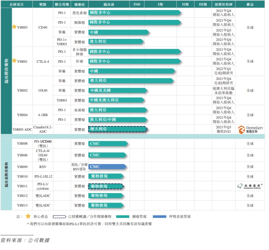 其臨牀階段的產品管線包括:1.YH003,一款有潛力成為同類最佳的靶向 CD40 的人源化 IgG2 激動性單克隆抗體;2.YH001,一款有潛力成為同類最佳的人源化抗 CTLA-4 IgG1 單克隆抗體;3.YH002,一款有潛力成為中國同類最佳的抗 OX40 IgG1 單克隆抗體;4.YH004,一款安全性良好的人源化抗 4-1BB IgG1 單克隆抗體。