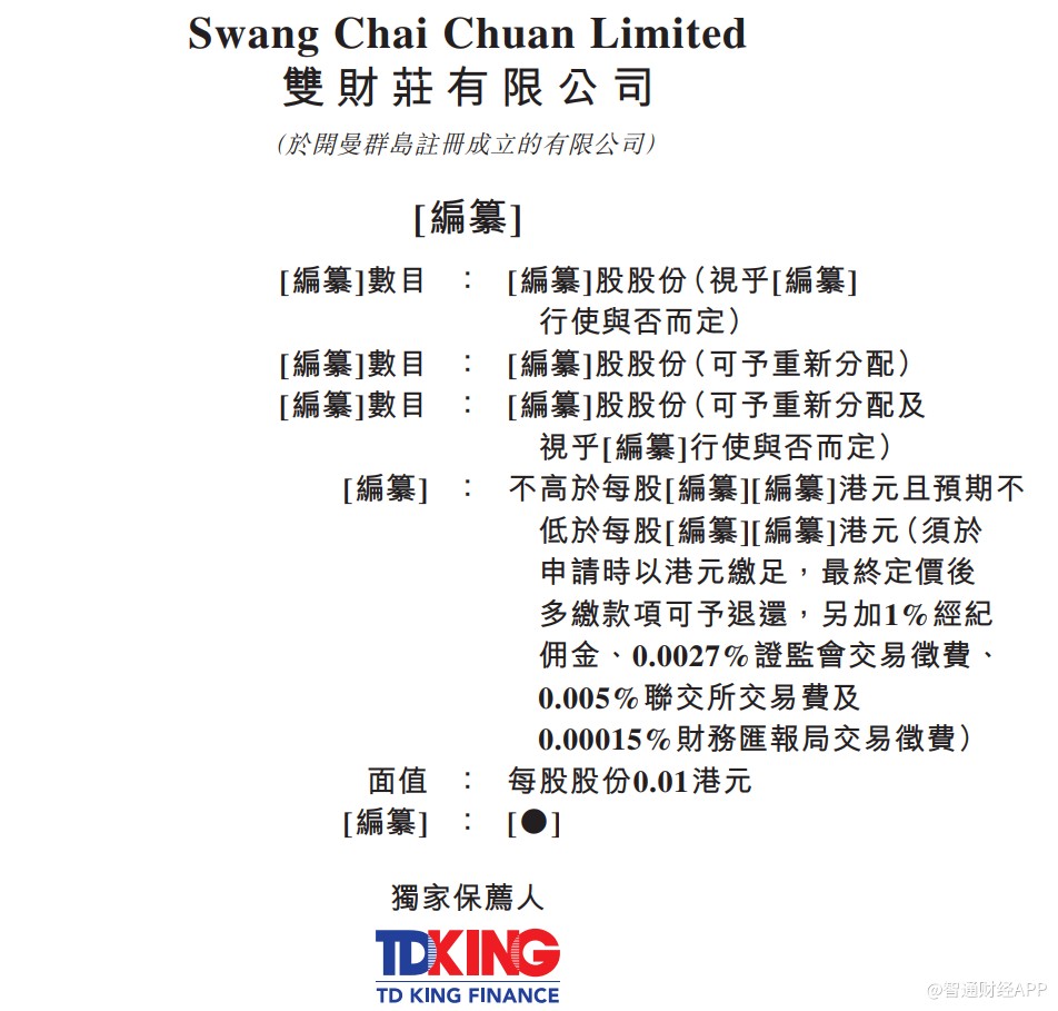 智通財經 APP 獲悉,據港交所 3 月 22 日披露,雙財莊有限公司向港交所主板提交上市申請,TD King Finance 為獨家保薦人。