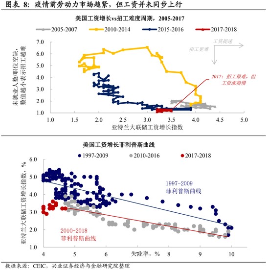 實際上,在疫情前美國勞動力市場就不斷趨緊,但工資和通脹水平脱節。當前美國的高通脹是近 40 年來未曾出現過的,尤其是疫情前的美國正處於勞動力市場緊缺但低通脹的環境。2015 年以來,美國勞動力市場就面臨着招工難的問題,勞動力市場緊張,而工資並未同步上漲,美國實際通脹水平和勞動力市場出現脱節,這背後的原因主要來自於勞動力市場行業結構的變化。2008 年金融危機之後,美國失業率飆升,而就業崗位的減少使得一部分人不得不進入工資議價能力較低的行業,比如交運倉儲、零售、休閒及酒店等行業。大量勞動力向低議價能力行業的補充也使得整體工資被壓降在了一個較低的水平。
