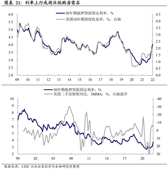 前期復甦的兩大支柱商品消費和地產面臨逆風,後續修復取決於服務。消費來看,美國商品消費已經透支,然而服務消費仍有缺口,隨着美國疫情好轉和政策放鬆,美國消費的支柱或逐漸從商品切換到服務,因此,美國消費的韌性將取決於服務消費。地產方面來看,隨着居家辦公的減少以及貸款利率的上升,疫情以來火爆的美國地產銷售可能將面臨降温,但受到疫情對購房需求的長期影響斜率可能不會過於陡峭。