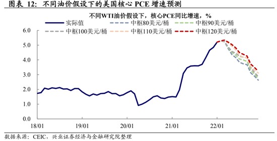 在此背景下,美國二季度通脹壓力可能仍然較高。整體來看,美國 2022 年核心 PCE 同比增速或將維持在 3% 以上的高增速平台。走勢呈現前高後低的形態:一季度受到高油價及 2021 年低基數的影響,核心 PCE 同比增速超過 5%;二季度整體受到供給的擾動可能仍然將整體維持在較高的平台;到年底預期核心 PCE 同比增速回落到 3.2% 左右。