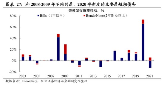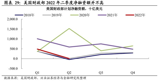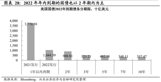 債務償付的角度看,長端上行對年內美國政府付息壓力影響相對有限。與 2008 年金融危機後不同的是,本輪美國財政刺激新發的債務多為 1 年以內的短期債務,這使得美國政府部門槓桿率在債務滾動到期後出現回落。從 2022 年年內到期的債務期限來看,年內到期壓力主要集中在短端,這意味着 10 年期利率上行對付息壓力的影響相對有限。而從新增的融資角度,2 季度整體來講是財政部新增融資的季節性低點,這也為長端利率的上行提供了窗口。