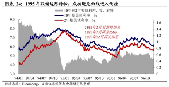 曲線形態調節的兩條路徑:壓低短端或抬升長端。邏輯上來看,要防止曲線進入倒掛,主要有兩種路徑,其一是邊際轉向,降低短端上行的壓力(比如 1995 年年中的短暫降息);其二是通過資產負債表的調整來側重性抬升長端利率(2017 年 10 月縮表開啓後,長端利率顯著上行)。