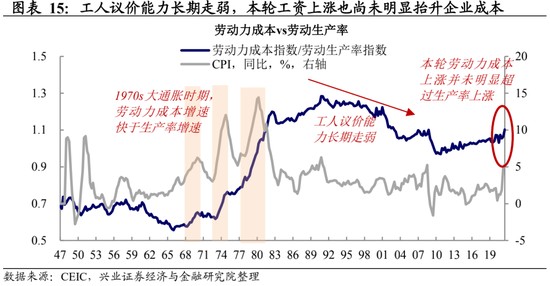 當前還未形成類似 70 年代的惡性工資 - 通脹螺旋。1970s 大通脹時期,美國勞動力成本增速顯著高於勞動名義生產率的增速,這意味着工資上漲在侵蝕企業利潤,從而使企業有因為勞動力成本上漲而進一步提價的動力。當前來看,儘管勞動力工資快速上升,但並未明顯高於勞動名義生產率的上升,這意味着當前的勞動力市場仍然在供需錯配的階段,而還未進入失錨的水平。