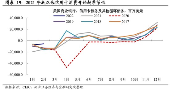 然而,超額儲蓄的支撐下,美國居民消費仍有一定的韌性。正如我們在 2022 年海外年報《縫縫補補又一年》中所詳細闡述的,美國經濟的回落可能是一個 “慢撒氣” 的過程。多輪財政刺激導致美國居民收入大幅高於疫情前水平,美國居民增加超額儲蓄約 2.4 萬億美元,這部分超額儲蓄 2021 年年底才剛進入消耗期。考慮不同收入羣體的消費偏好不同,樂觀情形下,其中約有 1.2 萬億美元將被用於消費,約佔美國年消費額的 7%,超額儲蓄對消費的影響可能將持續到年中。值得注意的是,從消費信貸數據來看,居民信用卡消費額自 2021 年年底以來超季節性,一方面印證了美國居民正在消耗超額儲蓄,另一方面也指向美國居民當前消費傾向仍高。