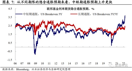 市場不斷抬升對通脹中短期走勢的預期——美債 1-5 年期部分計入了更多的通脹溢價。這一點既可以從不同階段、不同期限美債收益率上升幅度看出,也體現在隱含通脹預期數據上——中短期上升更快。由於此輪勞動力、供應鏈帶來的高通脹是近十年未見的,導致通脹水平和持續性在一開始被低估,於是後期的反補就更為顯著;另外,今年俄烏爭端導致的大宗品期貨價格暴漲,進一步催化了中短期的通脹預期。而 3 個月的國債收益率可以計入的中短期、長期的通脹預期均有限,更多受到政策利率的直接影響。