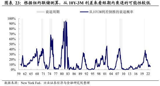 本輪美國企業居民的金融資產負債表都較為健康,短期內衰退概率仍低。與 2000 年和 2008 年相比,本輪最大的不同在於沒有出現金融機構的資產負債表崩塌從而陷入衰退的情況。美國當前居民和企業資產負債表相對比較健康,與此前兩輪衰退相比保護墊相對較厚。從聯儲根據 10Y-3M 利差測算的衰退概率來看,未來一年內陷入衰退的可能性較低,不到 10%。因此,美國未來經濟何去何從,可能將主要取決於聯儲後續的操作。
