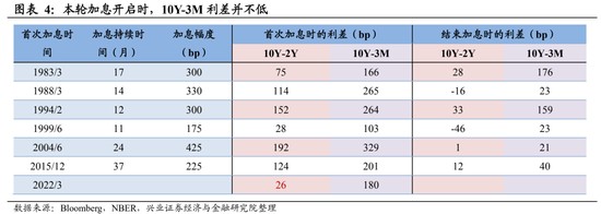此輪加息前,10 年期和 2 年期美債的利差已經處於較低的水平。在前文指出,加息週期開啓往往會出現收益率曲線整體上移且平坦化的走勢。而從 80 年代以來的歷史來看,加息開啓到出現 10Y/2Y 倒掛的間隔少則 7 個月,多則 45 個月。而此次加息當月就壓縮 10Y/2Y 至低位,若繼續則可能很快出現倒掛。如此快的收窄其實和利差本就在低位有關,在加息開啓前,10Y/2Y 的利差只有 26 個基點。