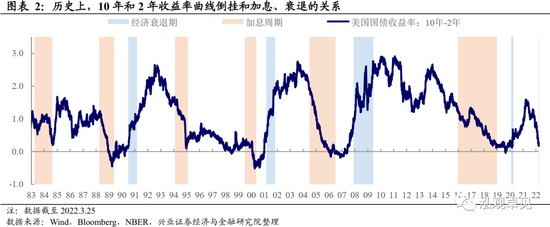 近期,美債 10 年期和 2 年期利率均呈現上行,且期限利差快速收窄,截至 2022 年 3 月 28 日 22 時,10 年期和 2 年期的期限利差已經不足 15bp。若期限利差進一步收窄,則可能出現倒掛。歷史經驗看,10 年期和 2 年期美債利差倒掛往往對經濟衰退有一定的預測作用,倒掛後不久聯儲也往往轉向降息。那麼在本輪中,美國經濟衰退風險幾何,聯儲是否會因此轉向?我們將一一探討。