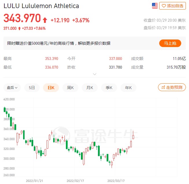 隔夜美股收盤時,Lululemon 上漲 3.7%,報 343.97 美元。強勁的業績推動了 Lululemon 的股價在盤後交易中應聲漲逾 7%。而今年以來,Lululemon 的股價累計下跌了約 12%。
