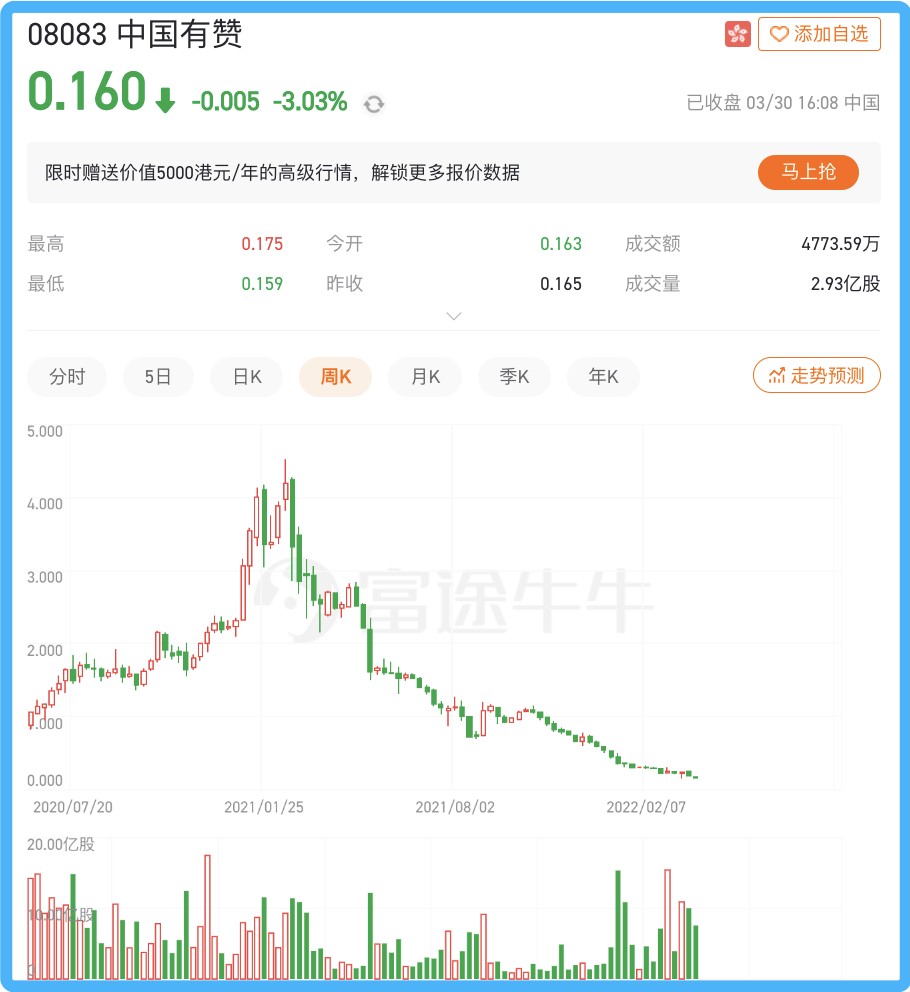 該消息一出,中國有贊股價下跌,日內跌幅達 16.84%,報 0.395 港元/股;截至 3 月 30 日,中國有贊股價僅售 0.16 港元/股,相較去年最高點的 4.5 港元/股,已跌去 96%,市值蒸發 746 億港元。