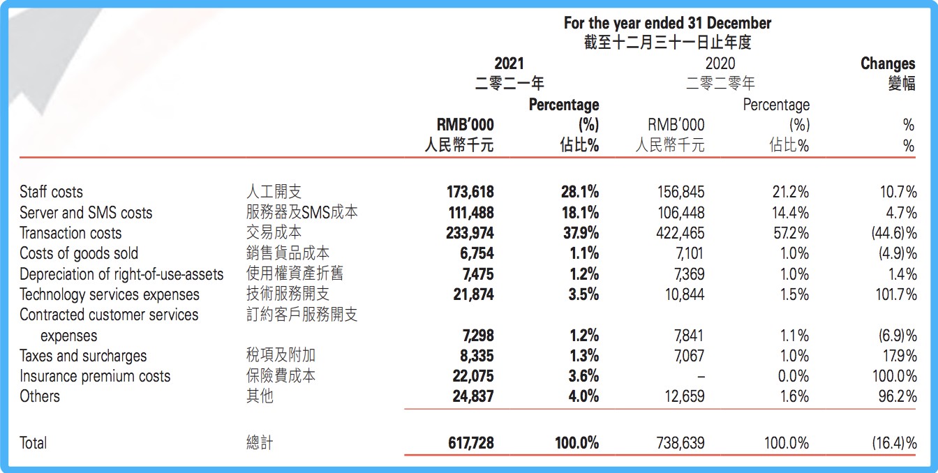 成本方面,由於 2021 年 2 月杭州有贊停止提供交易服務,有贊去年交易成本同比下降 44.6%%,約為 2.34 億元;銷售貨品成本同比也下降了 4.9%,開支僅 675.4 萬元;但這兩部分縮減卻因人工支出、購買運費險、技術服務開支增加而被抵消。
