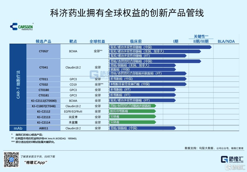 一方面,科濟藥業已建立 12 個創新候選產品管線,公司通過雙線佈局,在血液瘤和實體瘤兩個領域持續推進,並且均取得了積極的進展。特別是在潛力十足的實體瘤領域,公司的實體瘤 CAR-T 產品療效和安全性全球領先,其管線中就有多款處於臨牀階段的實體瘤 CAR-T 產品。