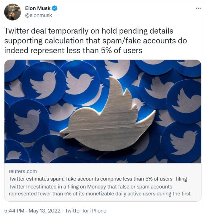 他在一条推文中说道:“推特交易暂停,直到有细节能够证明(推特上)垃圾账户或虚假账户的比例少于 5%。”