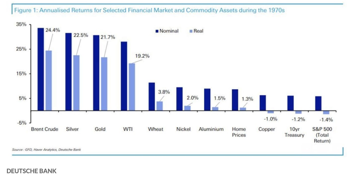 德意志銀行在週二發佈的一份的報告中,匯總了 20 世紀 70 年代滯脹時期一系列資產的表現。