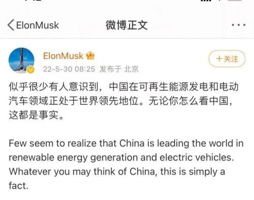 5 月 30 日,馬斯克發佈微博稱,“似乎很少有人意識到,中國在可再生能源發電和電動汽車領域正處於世界領先地位。無論你怎麼看中國,這都是事實。”