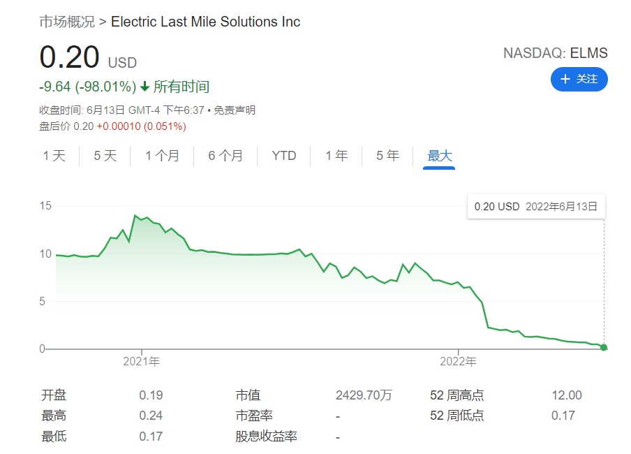 美國電動汽車初創公司 Electric Last Mile Solutions(ELMS)週一稱,計劃通過美國《破產法》的破產程序進行清算,這一決定是在該公司通過 SPAC 上市近一年後做出的,而就在四個月前,該公司 CEO 和董事長雙雙辭職。