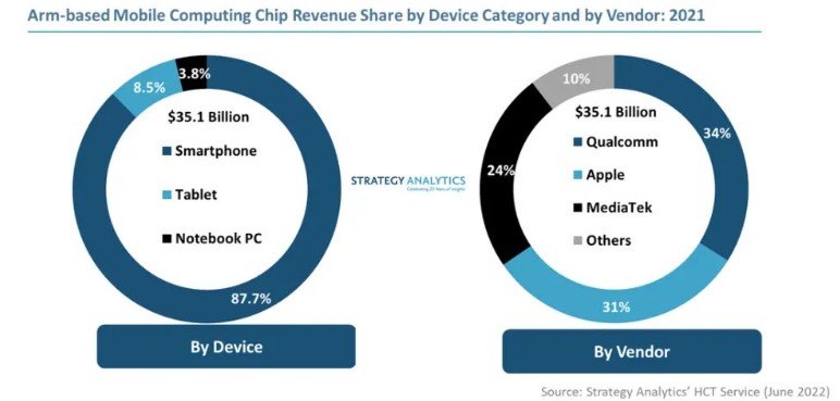 2021 年,智能手機、平板電腦和筆記本電腦處理器分別佔基於 Arm 的移動計算芯片總營收的 88%、9% 和 3%。