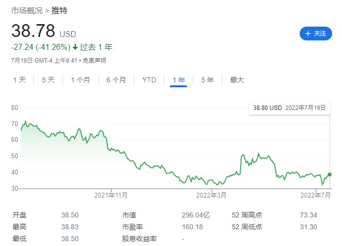 截至發稿,推特漲 1.02%,報 38.82 美元/股,遠低於馬斯克 54.20 美元的要約收購價。近一年中,推特股價跌去了四成市值。