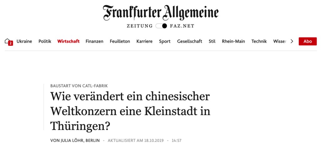 《法蘭克福匯報》當天報道的標題是這樣的:「中國跨國公司,如何改變圖林根州的小鎮?」——工廠位於阿恩施塔特,一個 2.8 萬人口的小鎮,寧德時代帶來了超過 2000 個工作崗位。