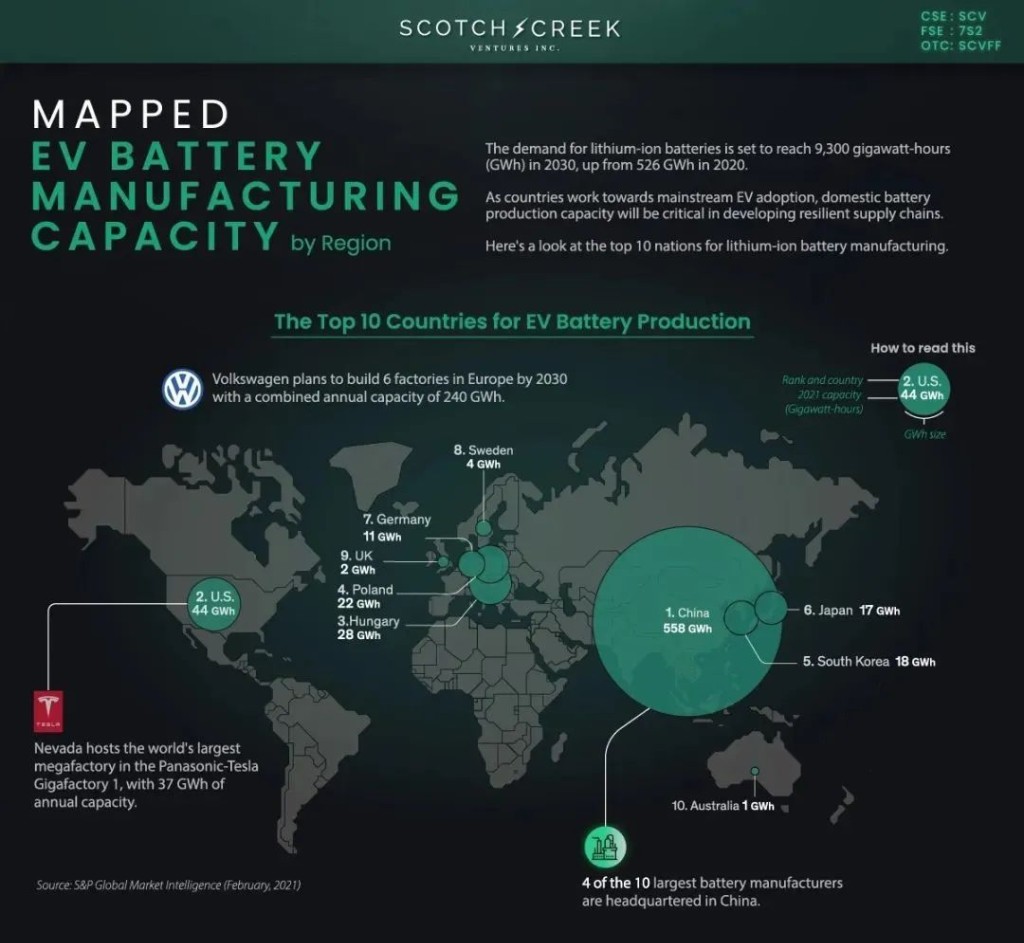 先來看 Visual Capitalist 公佈的數據:2021 年我國在建動力電池產能達到了 556GWh,冠絕全球——美國去年在建產能 44GWh、整個歐洲大陸加起來僅為 67GWh。