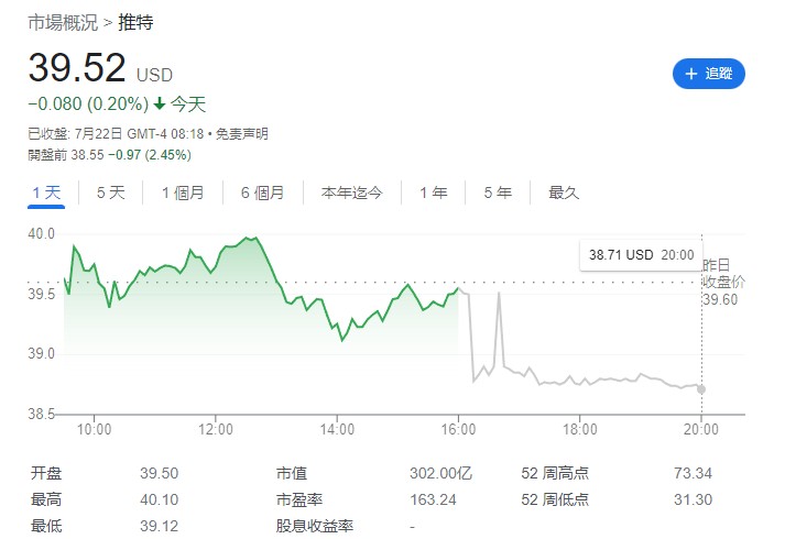 財報發佈後,推特盤前跌 2.45%,報 39.52 美元/股,遠低於馬斯克 54.20 美元的收購要約價。