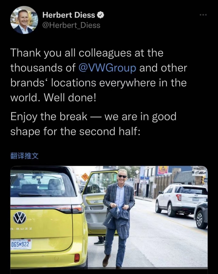 2022 年 7 月 22 日,歐洲中部夏令時間下午 6 點 10 分(約北京時間 7 月 23 日 0 點 10 分),大眾集團宣佈其 CEO 迪斯(Herbert Diess)將於 8 月底離職,繼任者是保時捷 CEO 奧博穆(Oliver Blume),將於 9 月 1 日上任。