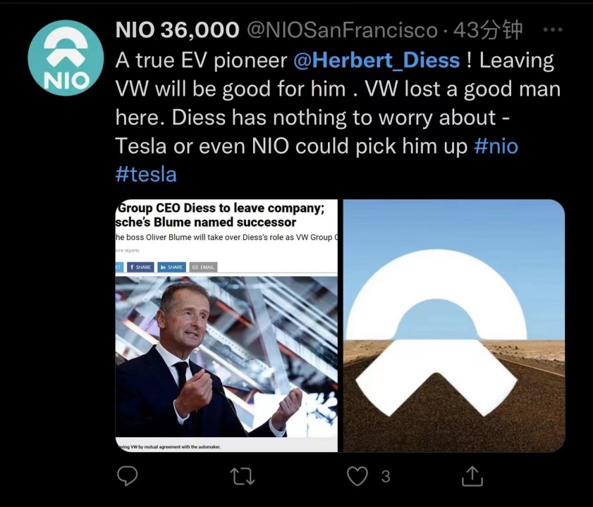 有意思的是,蔚來很快在推特上對迪斯發出了邀請,認為 “迪斯是真正純電汽車的先鋒人物……離開大眾對迪斯是一件好事,大眾失去了一位好的領導者。他沒什麼可擔心的,特斯拉或者蔚來都歡迎他。”