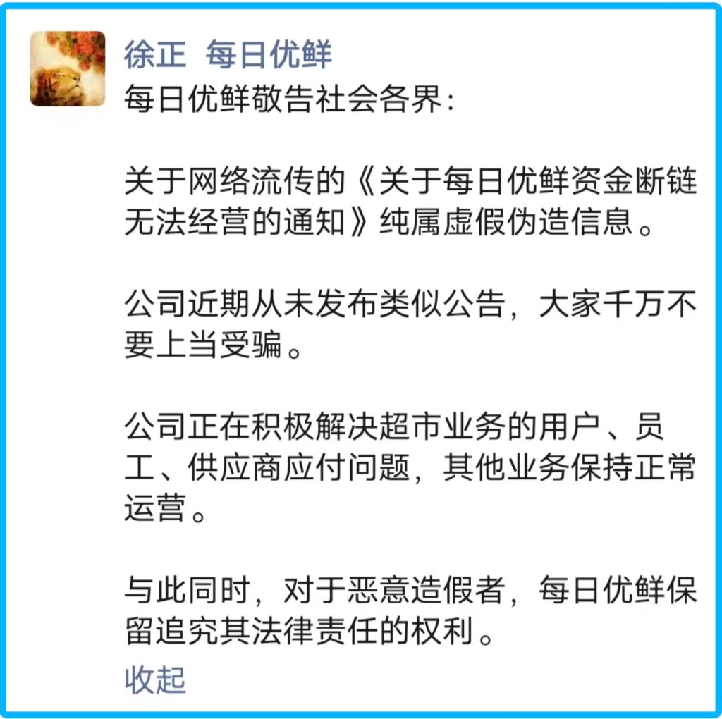 不法分子還趁機鑽空子,8 月 1 日,一則《關於每日優鮮資金斷鏈無法經營的通知》在網絡上流傳,表面是為供應商處理資金退付問題,實則是虛假信息。徐正對此在朋友圈闢謠:公司近期從未發佈類似公告,大家不要上當受騙。而後,其再次強調 “公司正在積極解決超市業務的用户、員工、供應商應付問題,其他業務保持正常運營”。