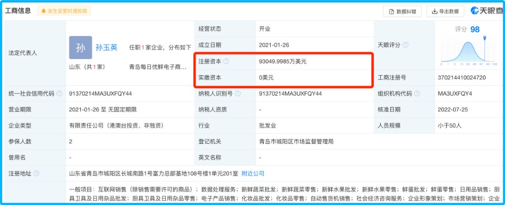 根據天眼查,前者註冊資本約 31.95 億元,實繳資本 27.86 億元;後者註冊資本 9.30 億美元(約 62.99 億元),實繳資本 0 美元 。兩家公司看似都叫 “每日優鮮”,背後股東也都有每日優鮮香港集團股份有限公司,但相互之前並沒有直接股權關係。