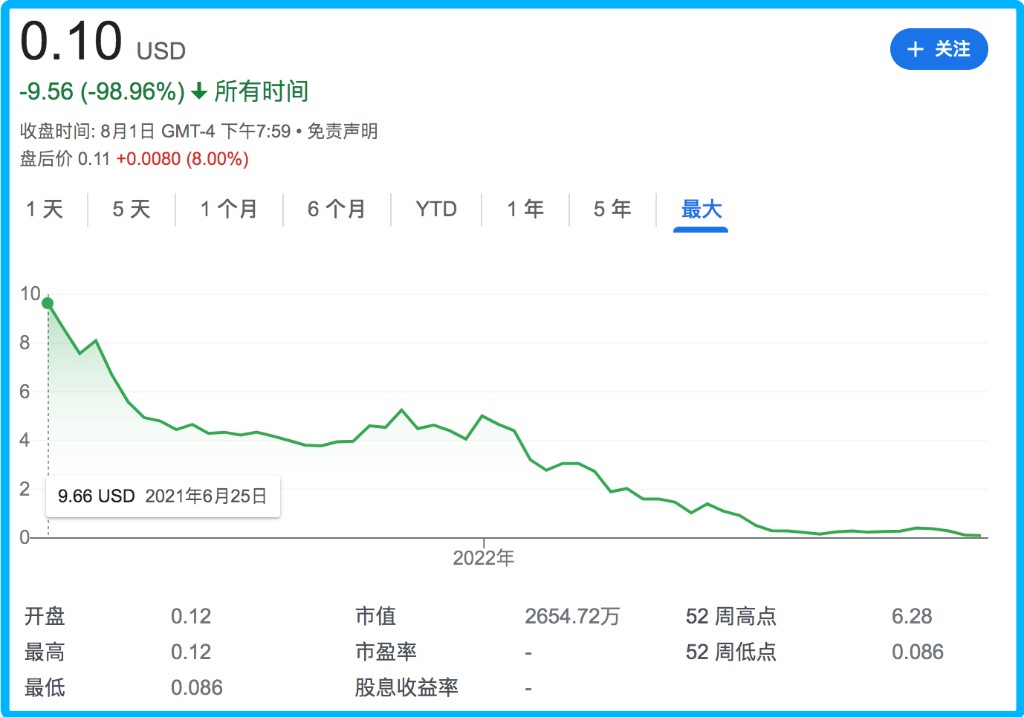 每日優鮮上市後股價一路下跌,尤其 2022 年,公司連續兩次收到納斯達克退市警示,截至 8 月 1 日,每日優鮮股價僅為 0.10 美元,較 13 美元/股的發行價縮水逾 99%,當前總市值僅餘約 2650 萬美元。