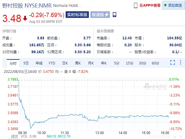 截止發稿,野村控股跌 7.69%,報 3.48 美元/股。